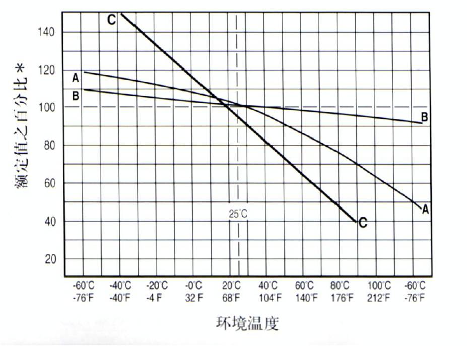 保险丝所处小环境温度或已知的工作温度, 对保险丝的动作是有影响的环境温度越高, 保险丝的工作时就越热, 其寿命也就越短不管是 UL 规格还是 IEC规格, 保险丝的各项指标都是指在25 0C ,如小环境工作温度较高,则要考虑保险丝的温度折减率(见下图)。