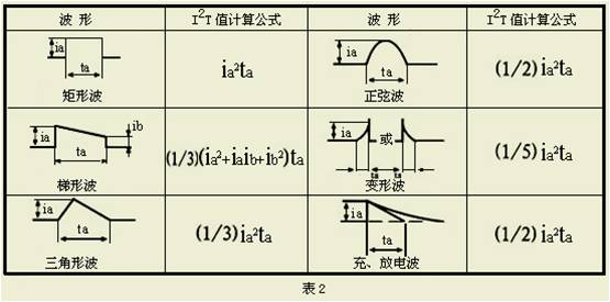 原则: 选用熔断器时必须考虑 If2t > Ir2t, 即熔断器的熔化热能应大于浪涌电流释放的热能 几种典型波形的I²t 计算方法(见下图)