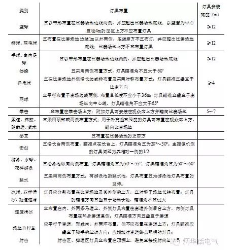 体育馆照明设计,设计者首先必须了解和掌握体育馆照明的要求:即照度标准和照明质量。然后要依据体育馆建筑结构可能安装高度和部位确定布灯方案。由于体育馆空间高度的局限,既要达到照度标准,又要满足照明质量要求,因此应选用配光合理、有合适距离比和亮度限制较严的灯具。一般来说,当灯具安装高度低于6米时,宜选用荧光类灯具;当灯具安装高度在6~12米时,宜选用功率不超过250W的金属卤化物类灯具;当灯具安装高度在12~18米时,宜选用功率不超过400W金属卤化物类灯具;当灯具安装高度在18米以上时,宜选用功率不超过1000W的金属卤化物类灯具;体育馆照明不宜使用功率大于1000W的泛光灯具。而LED灯则打破原有的光源选择原则,功率大大降低。不同运动项目灯具安装高度及布置要求见表2。