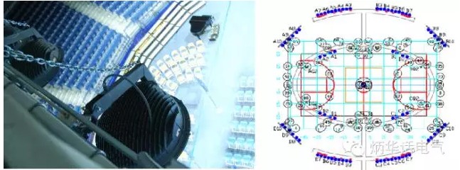 美国圣母大学(University of Notre Dame)位于美国印第安那州,是世界顶尖的高等学府,创建于1842年。其体育馆是全美大学生联赛的主要赛场之一,达到我国甲级体育建筑标准。2013年,该体育馆对场地照明系统进行改造,用LED灯替换原有金卤灯,共采用Musco公司的605W LED灯具80套,130W LED灯8套,满足高清电视转播要求,平均垂直照度达1850lx,场地照明系统总的安装功率仅为49.44kW,比原有金卤灯系统减少73%,预计十年运行、维护成本可节省220余万元人民币(厂家承诺十年质保)。图3为体育馆灯具布置图,及灯具细部。很明显它是多功能体育馆,笔者参观时即将举行开学典礼,场地由篮球场转换成会场。灯具安装在马道上,方便安装、调试,灯具散热系统依稀可见,保证了照明系统的长寿命,正因为此,厂家承诺十年质保,这在中国市场恐怕独此一家。图中金属链条是防跌落系统,高空中如果有金属部件不慎跌落,有可能酿成悲剧。灯具布置图中蓝色圆点为605W灯具,红点为130W灯具。